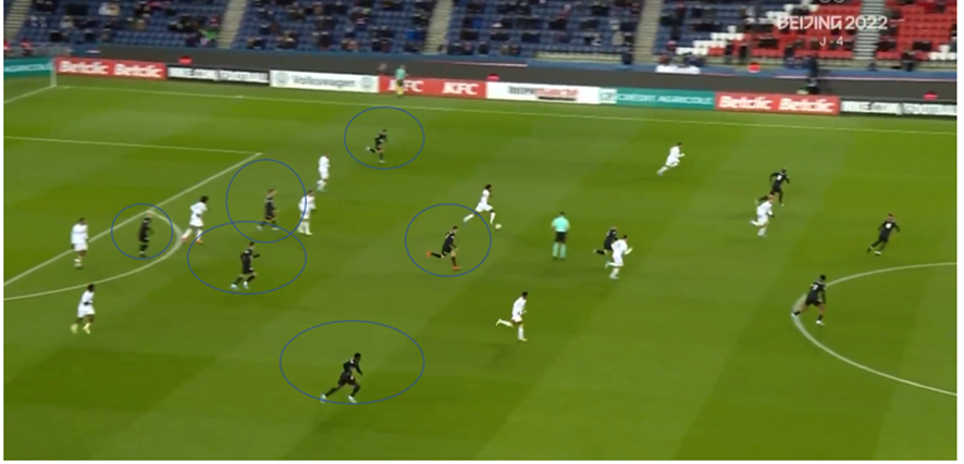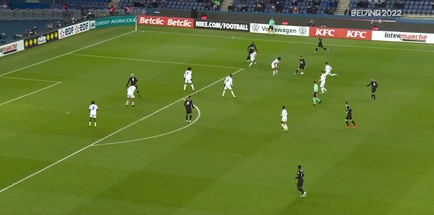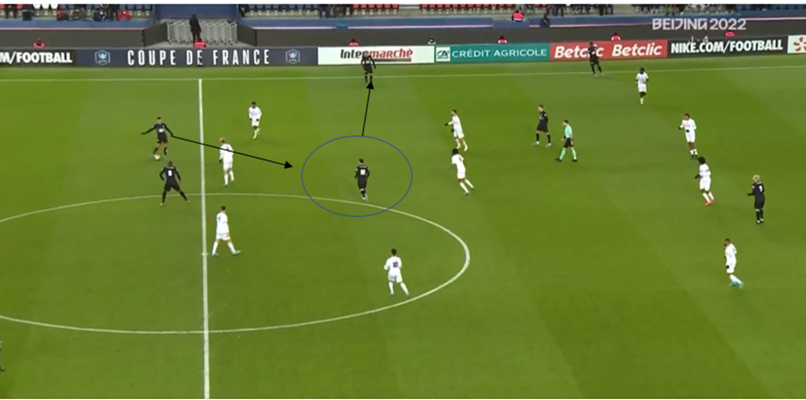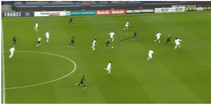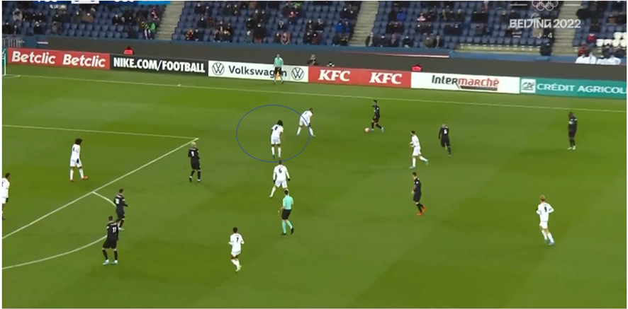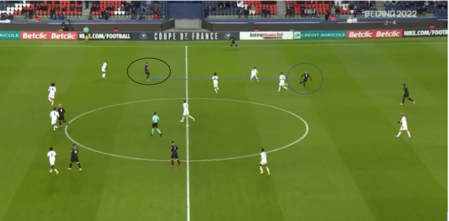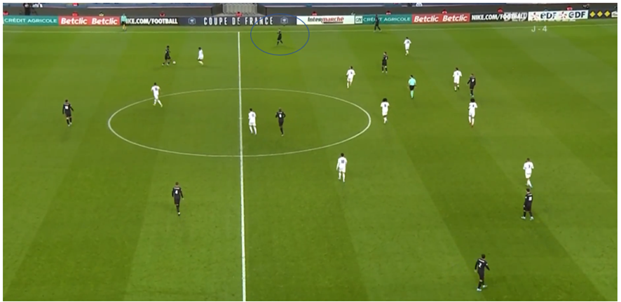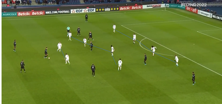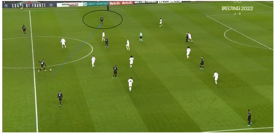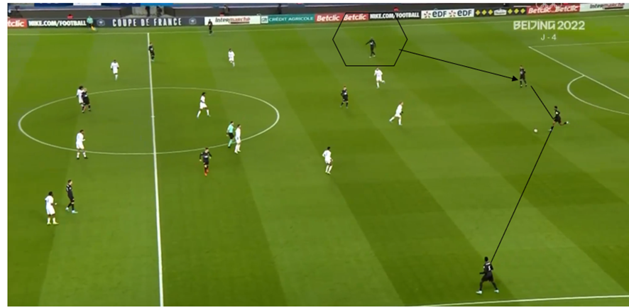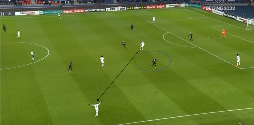 Verratti entiende el fútbol como pocos. Su presencia en la izquierda, ya sea para atraer al extremo (dos primeras imágenes) y dar amplitud con Nuno o, para aparecer a espalda del extremo derecho cuando saltan a Kimpembe, es clave. El italiano es buenísimo para atraer.