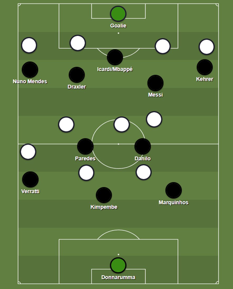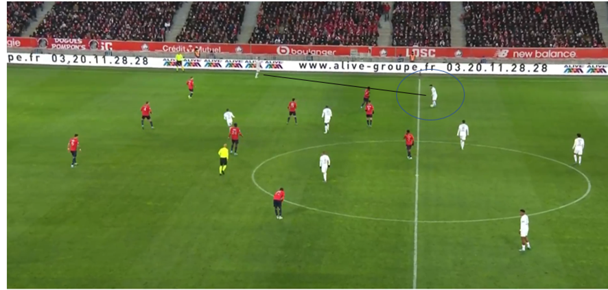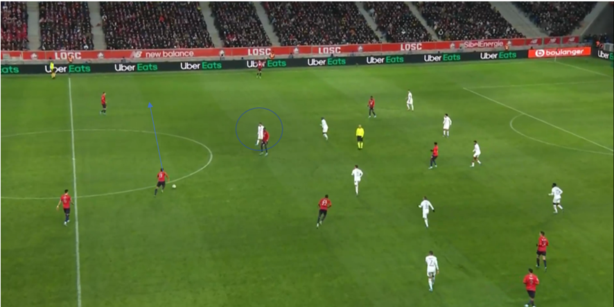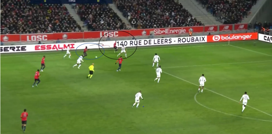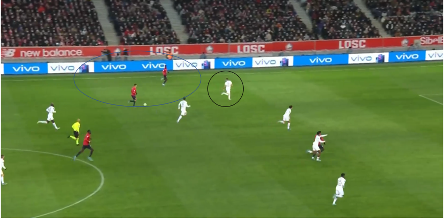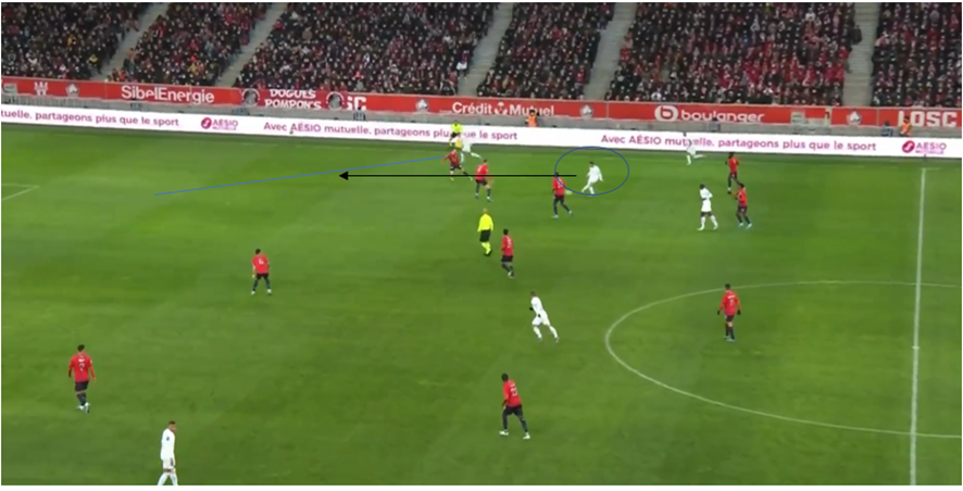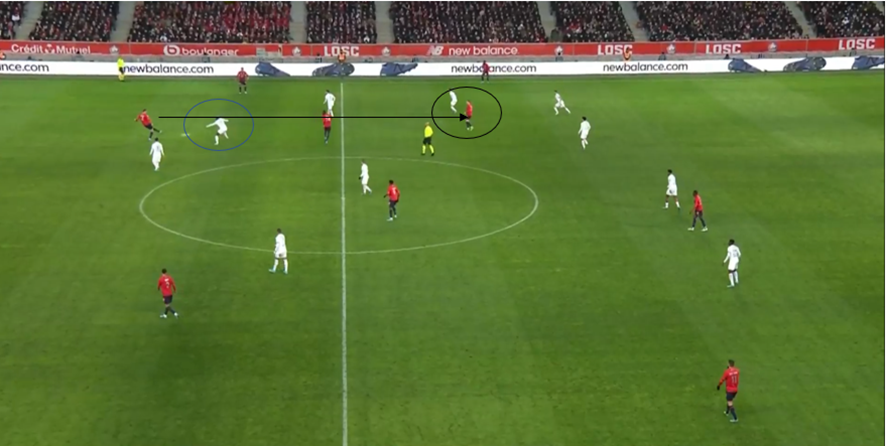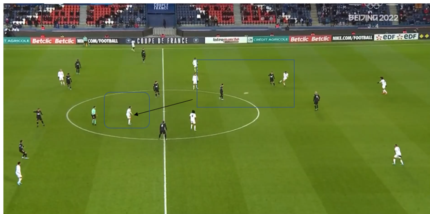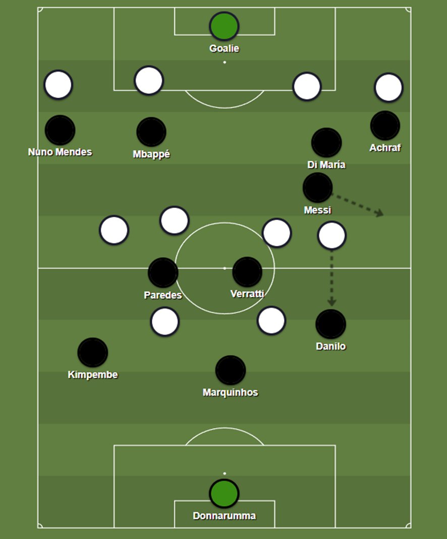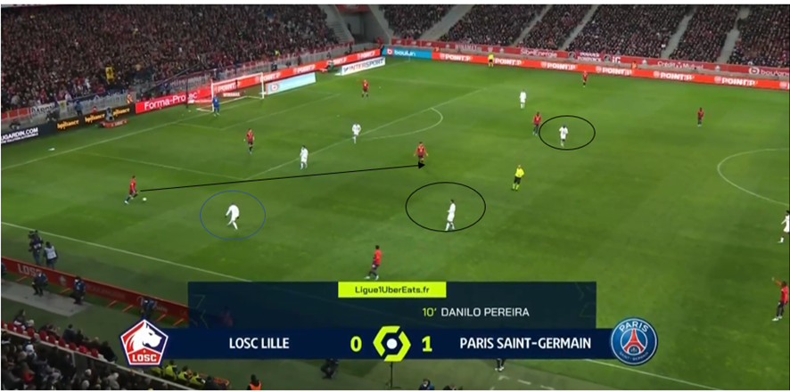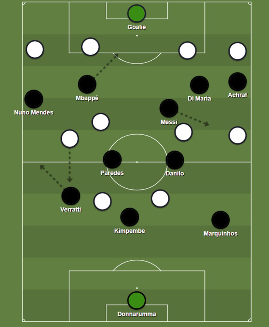 Vamos a recrear lo que hace Pochettino con Verratti gracias a los compañeros de @Effmatch: el mediocentro italiano se coloca en la izquierda, atrae al extremo derecho y Nuno Mendes recibe solo en 1vs1 con su lateral. Así se generó, por ejemplo, el 0-1 contra el Lille.
