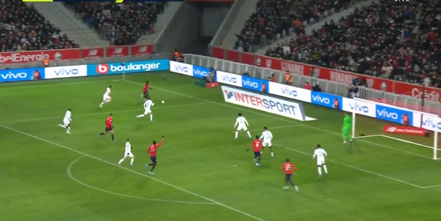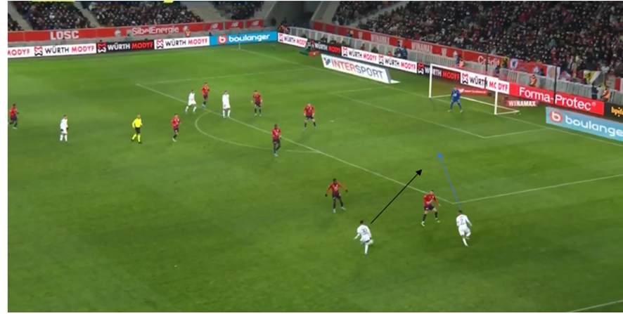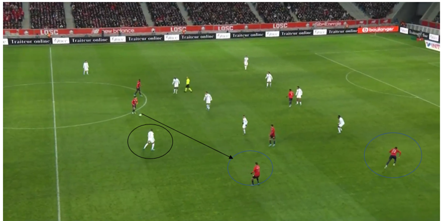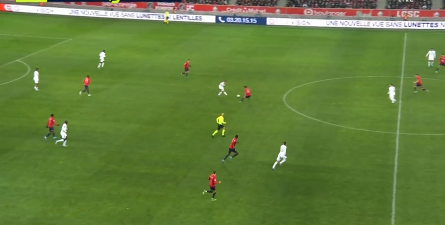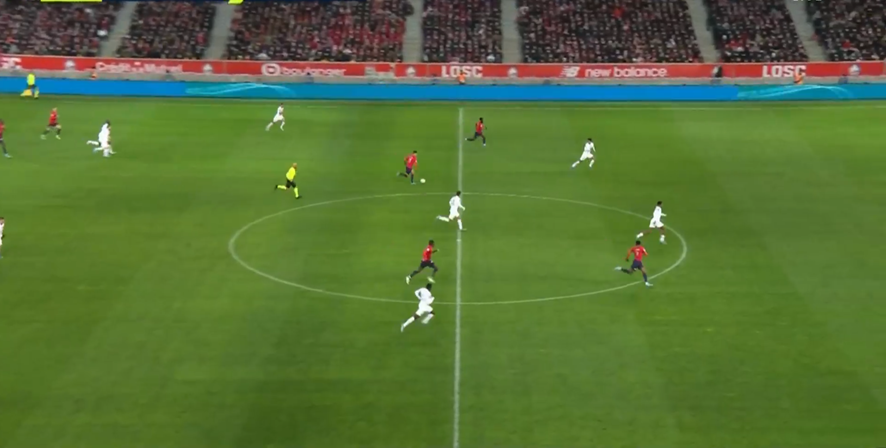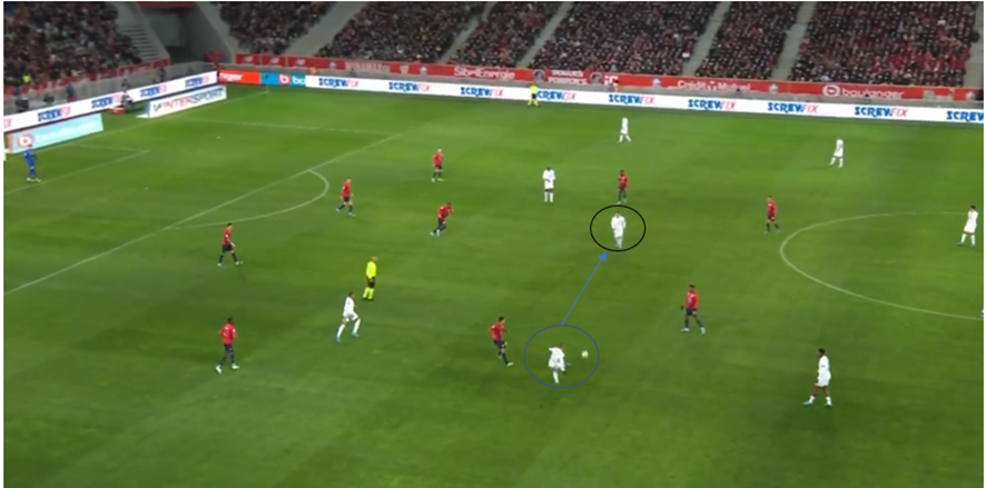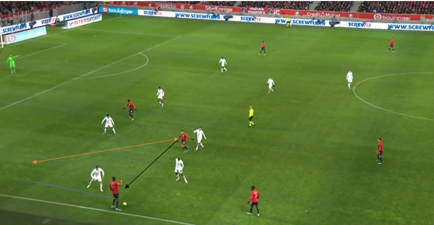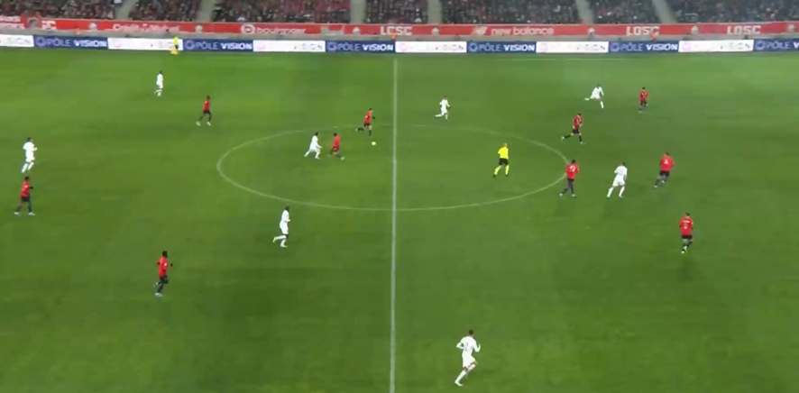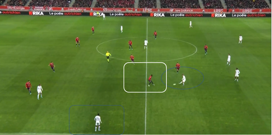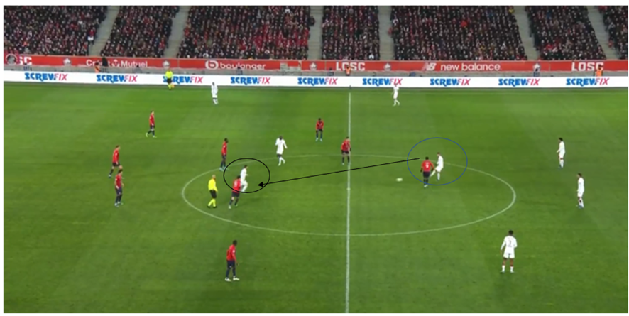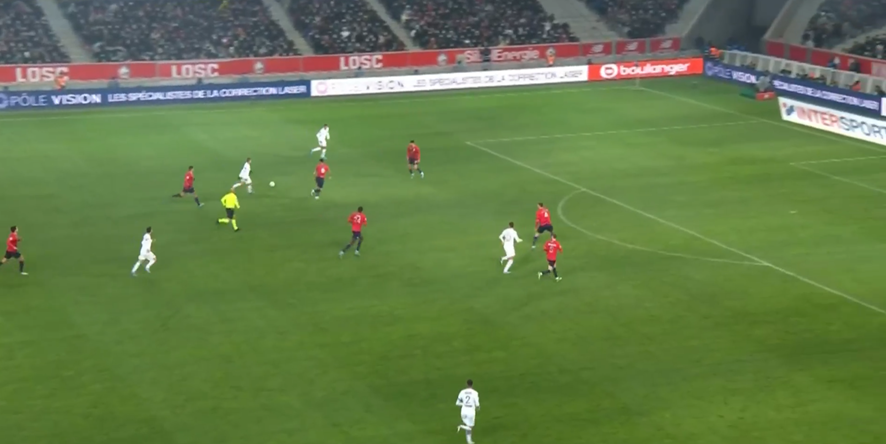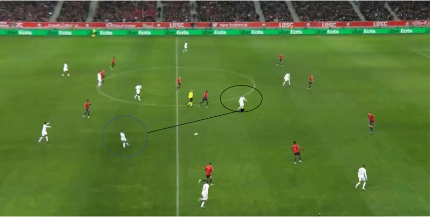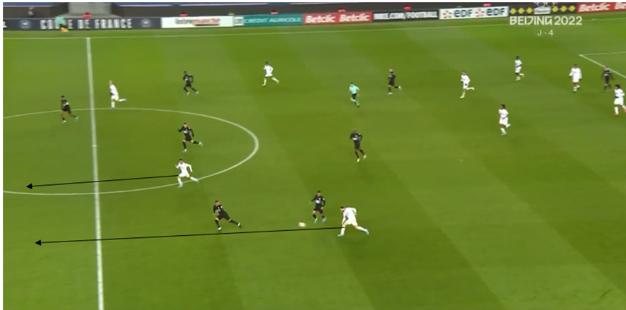 Vamos a recrear lo que hace Pochettino con Verratti gracias a los compañeros de @Effmatch: el mediocentro italiano se coloca en la izquierda, atrae al extremo derecho y Nuno Mendes recibe solo en 1vs1 con su lateral. Así se generó, por ejemplo, el 0-1 contra el Lille.