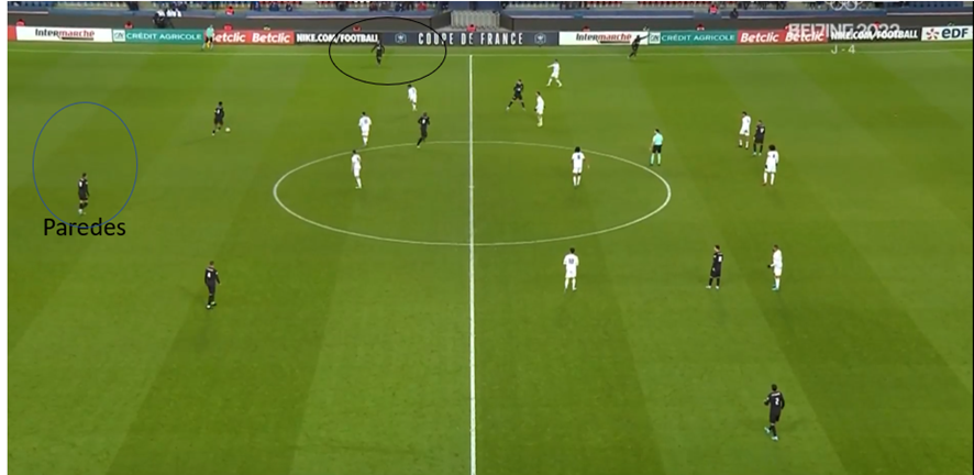 El PSG sale SIEMPRE con tres centrales. Es decir, Danilo se coloca en la derecha como tercer central, Paredes como líbero o Verratti en el sector izquierdo. Lo hace casi siempre y más cuando el rival presiona con dos delanteros. Es la seña de identidad de Pochettino.