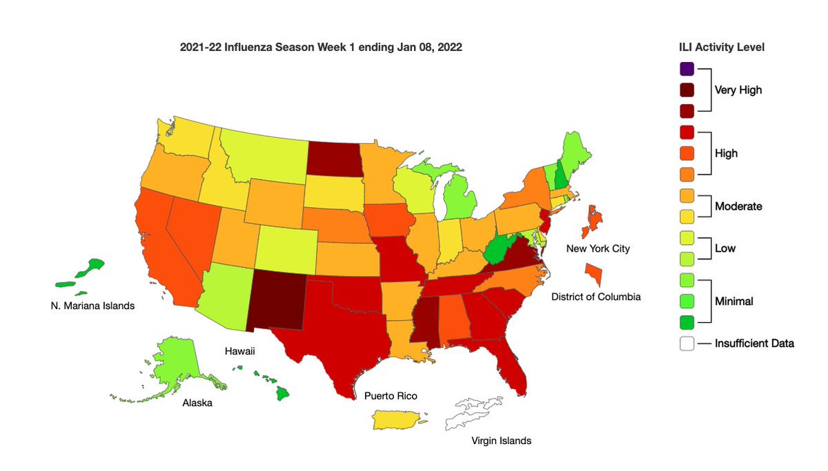 2. #Flu activity is still at low levels & it actually dropped last week. Is that because of data filing delays over the holidays? Because people are avoiding health care because of Covid? Or is Omicron somehow crowding out flu? Need someone smarter than me to answer that Q.