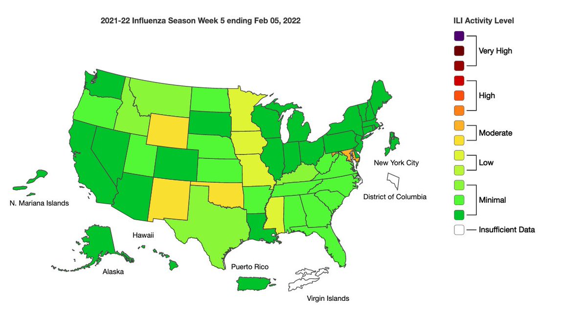 2. Currently influenza-like activity is "below baseline." That could mean we've passed the peak of flu season for winter 2021-22. That said, #flu B activity often occurs late in the season — sometimes into March & April. So there could be more flu later.