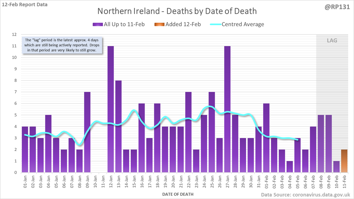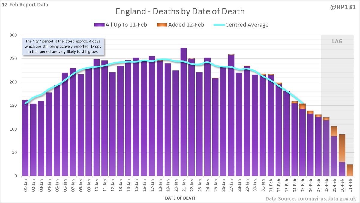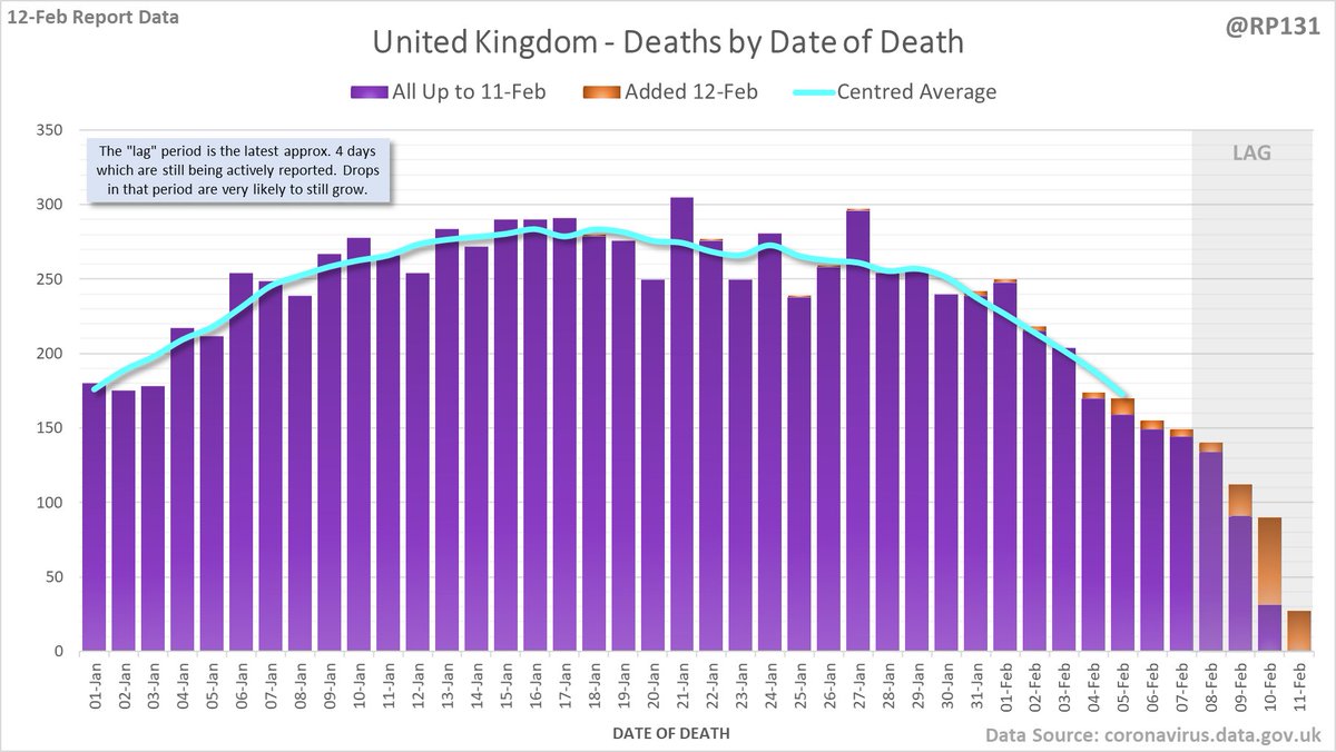 167 new #covid19uk deaths reported today (12-Feb). This brings the rolling average by date of death (allowing 4 days for lag) to 189, equivalent to around 02-Jan (i.e. 34 days ago), a reduction of 66 (26%) in the last week.