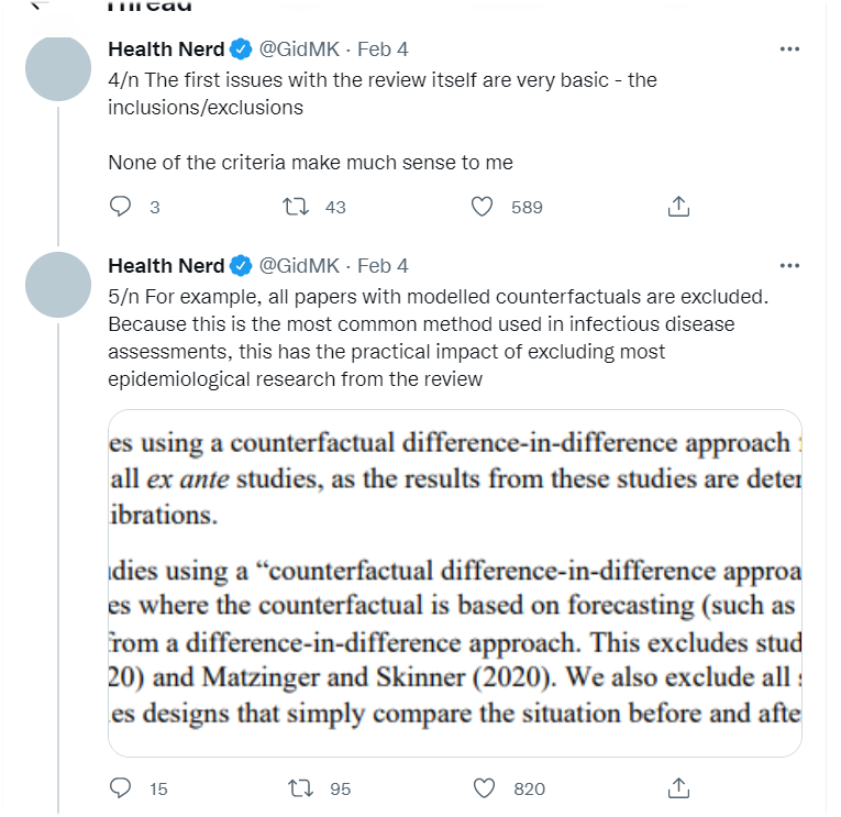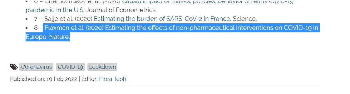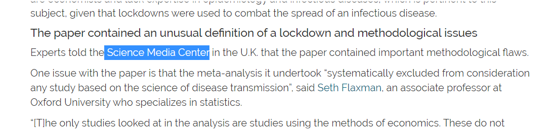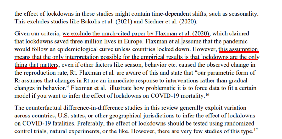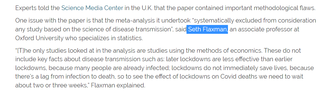 Hundreds of papers have been written on lockdowns, with various conflicting conclusions. Why limit the assessment to only papers that claim the lockdowns worked? And of course @healthfeedback privileges one of those papers above all else: Flaxman 2020.