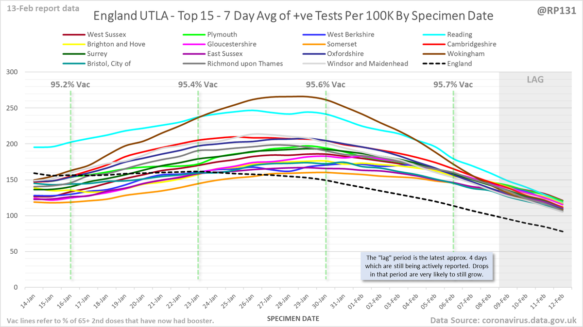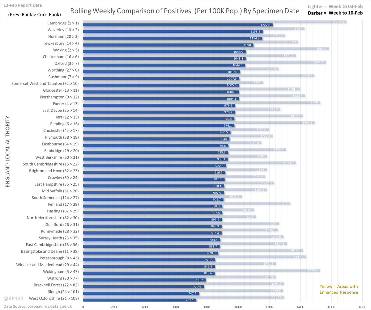 Rolling weekly comparison of totals up to 3 days ago. This chart is useful to see the relative movements of the local authorities towards the top of the list.