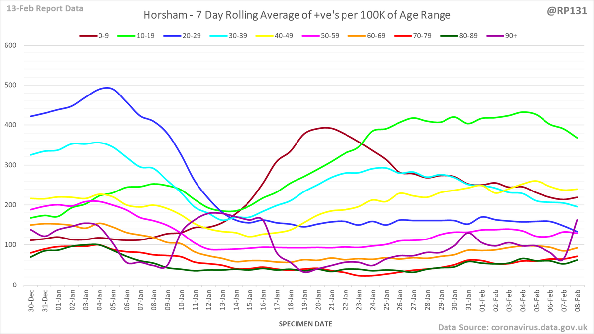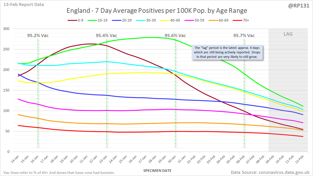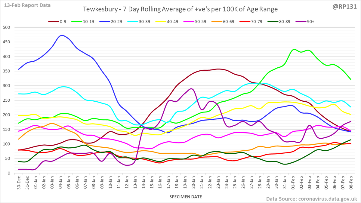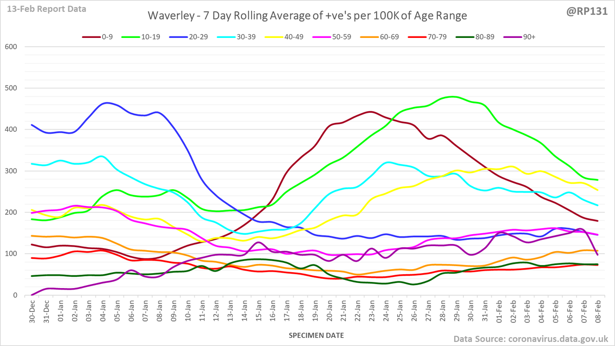 52 new #covid19uk deaths reported today (13-Feb). This brings the rolling average by date of death (allowing 4 days for lag) to 175, equivalent to around 01-Jan (i.e. 36 days ago), a reduction of 81 (32%) in the last week.