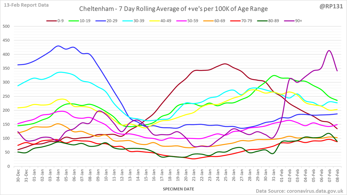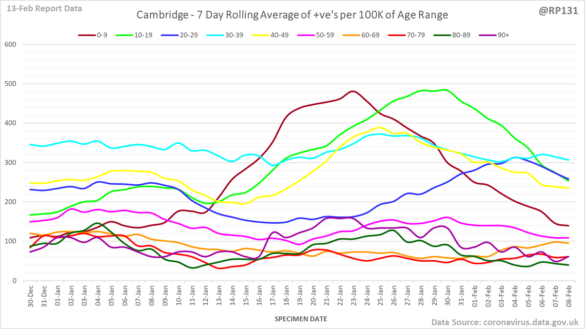 Age breakdown chart for Cambridge (current top LA). Rolling average of positive tests by specimen date per 100K population of each age range.