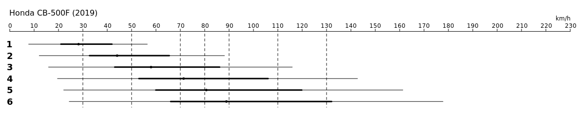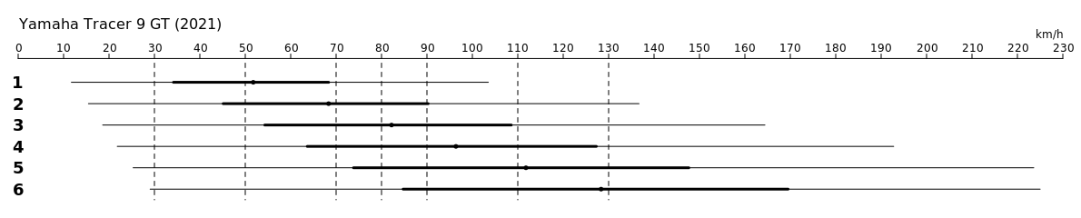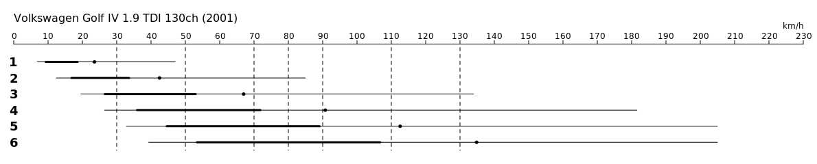 Explications: pour chaque rapport de chaque véhicule, je fais une échelle des vitesses atteignables sous ce rapport à différents régimes moteurs. Le trait fin (le plus long) va du régime du ralenti moteur jusqu'à la ligne rouge (cappé à la vitesse maximale).