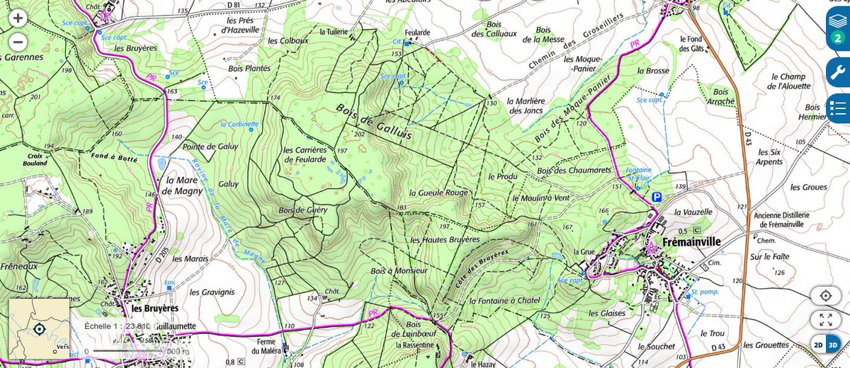 L'itinéraire que nous avons fait, et la carte de l'endroit sur Géoportail (geoportail.gouv.fr/carte?c=1.8441…). Nous avons été particulièrement emmerdés (i.e., emboués) entre 3km et 5km sur la balade (mais de 5km à 7km ce n'était pas terrible non plus).