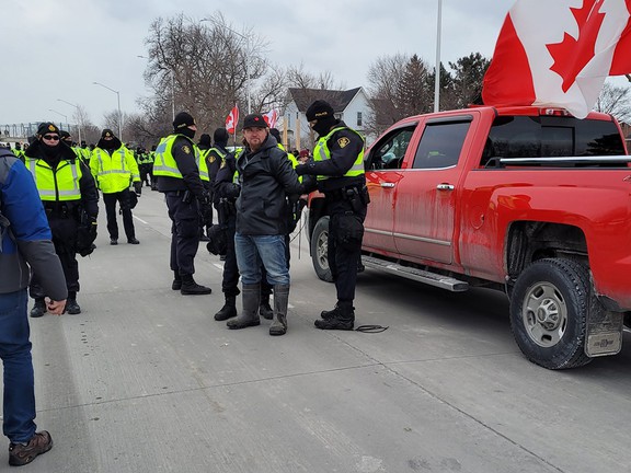 Hoje pela manhã, forças da OPP e da RCMP se juntaram à polícia de Windsor e começaram a desocupação dos veículos e manifestantes. Num deslocamento contínuo e pacífico, os policiais iam se comunicando à medida que avançavam solicitando aos manifestantes a saída do local (+)