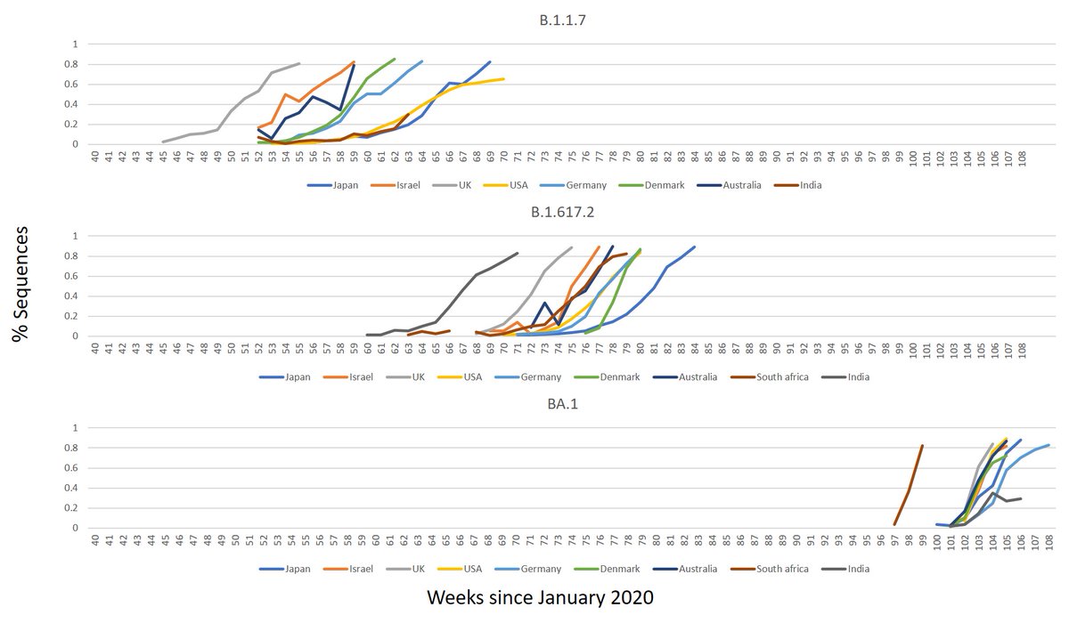 The separation between the rise in the country of origin and the other countries does not demonstrate that the variant broke the borders only after it took over nationally as the data are lacking the initial lag growth phase which theoretically prolonged the graphs.