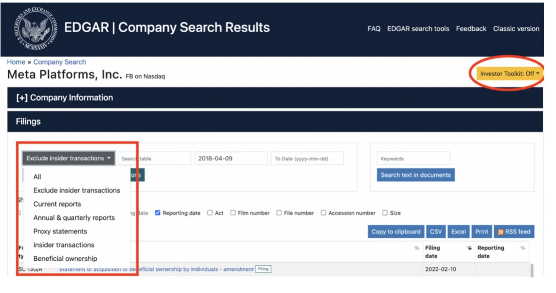 Para encontrar los informes de las empresas americanas sin duda la mejor opción es la página de la SEC, os recomiendo que que desactivéis el Investor Toolkit y en el menú podréis filtrar que tipo de documentos queréis ver