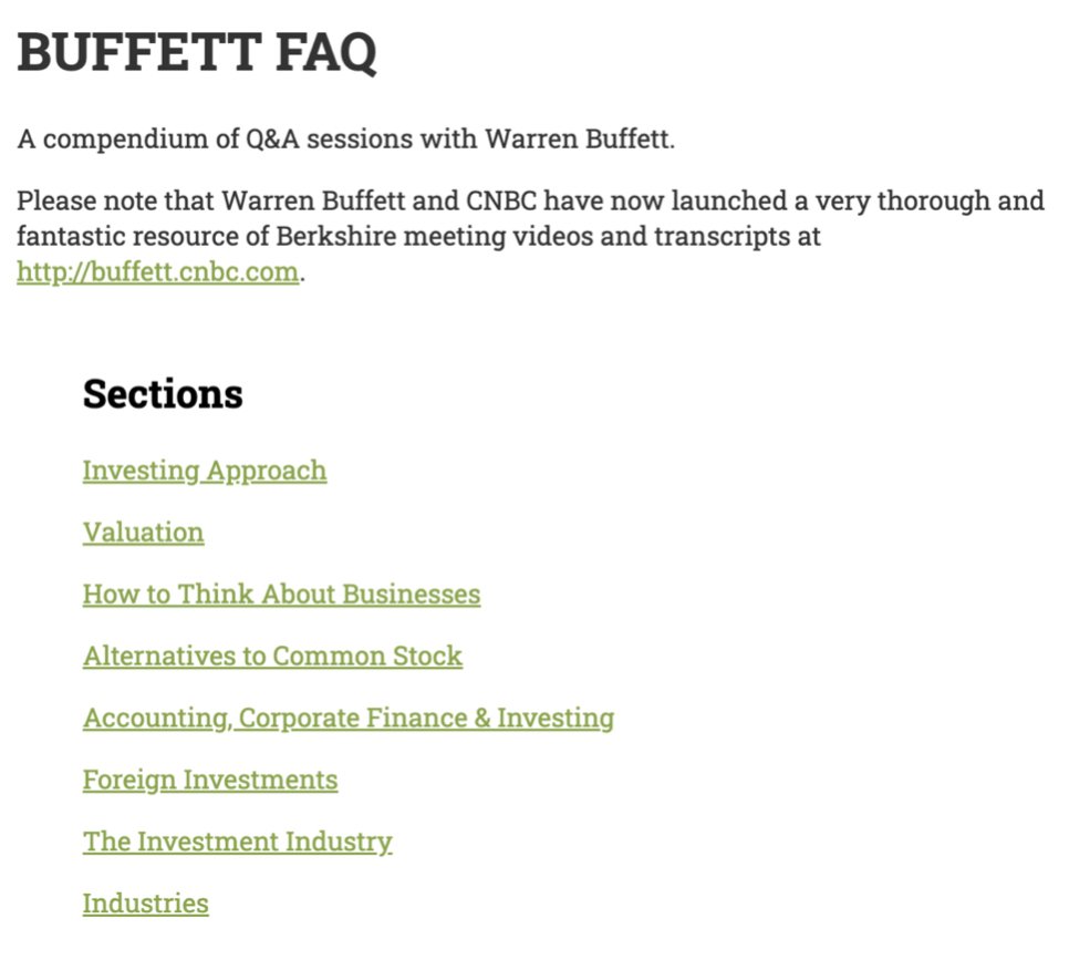 Si quieres aprender las enseñanzas de Warren Buffett esta es una página donde encontrarás muchísimo contenido de sus entrevistas y conferencias anuales, todo ordenado por temáticas y preguntas
