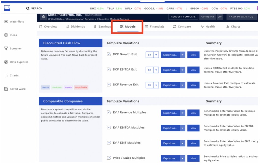 En Finbox tenemos una opción que es de pago, pero os puede servir, podéis descargarlos los modelos de las empresas en Excell para valorar las compañías, de forma gratuita puedes consultarlo pero no podrás descargarlo. finbox.com