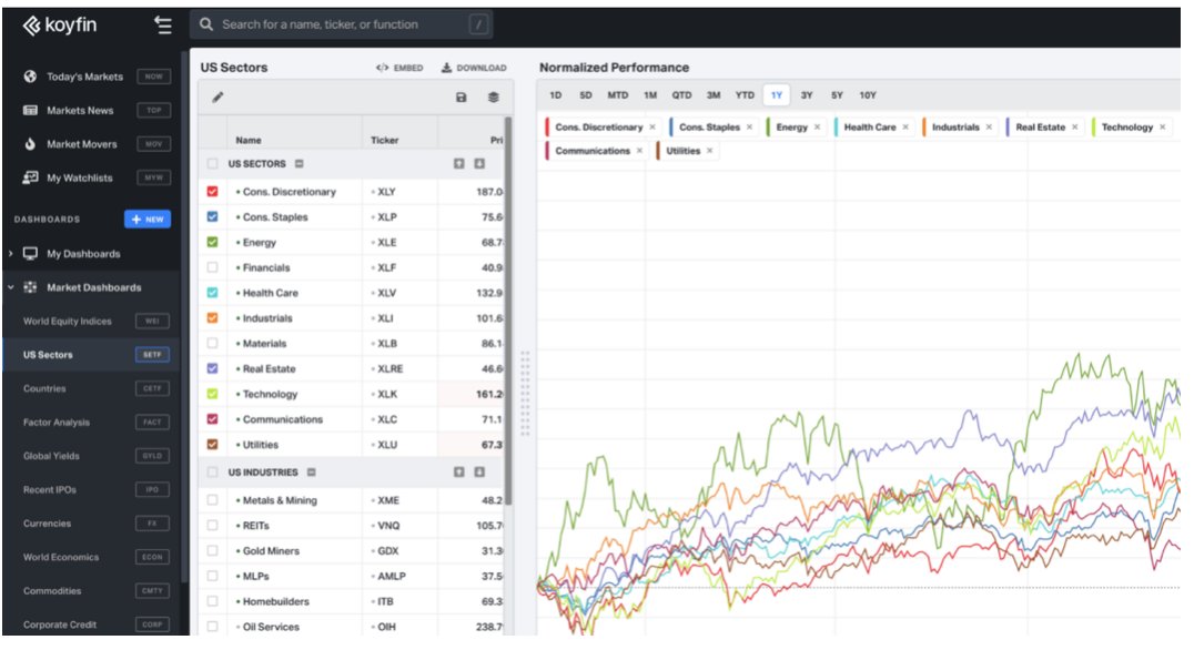 En Koyfin tenemos también datos de las compañías tiene una parte gratuita y otra de pago, pero tiene una función interesante donde podéis graficar por sectores o materias primas, al igual que TIKR es una plataforma muy completa app.koyfin.com