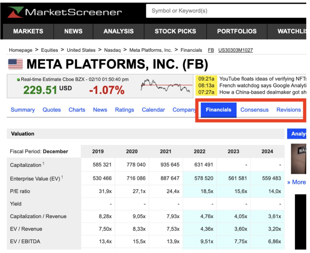 Otra página muy intuitiva es MarketScreener donde os dan una valoración rápida de las empresas de un solo vistazo y también podréis consultar las revisiones del consenso de analista