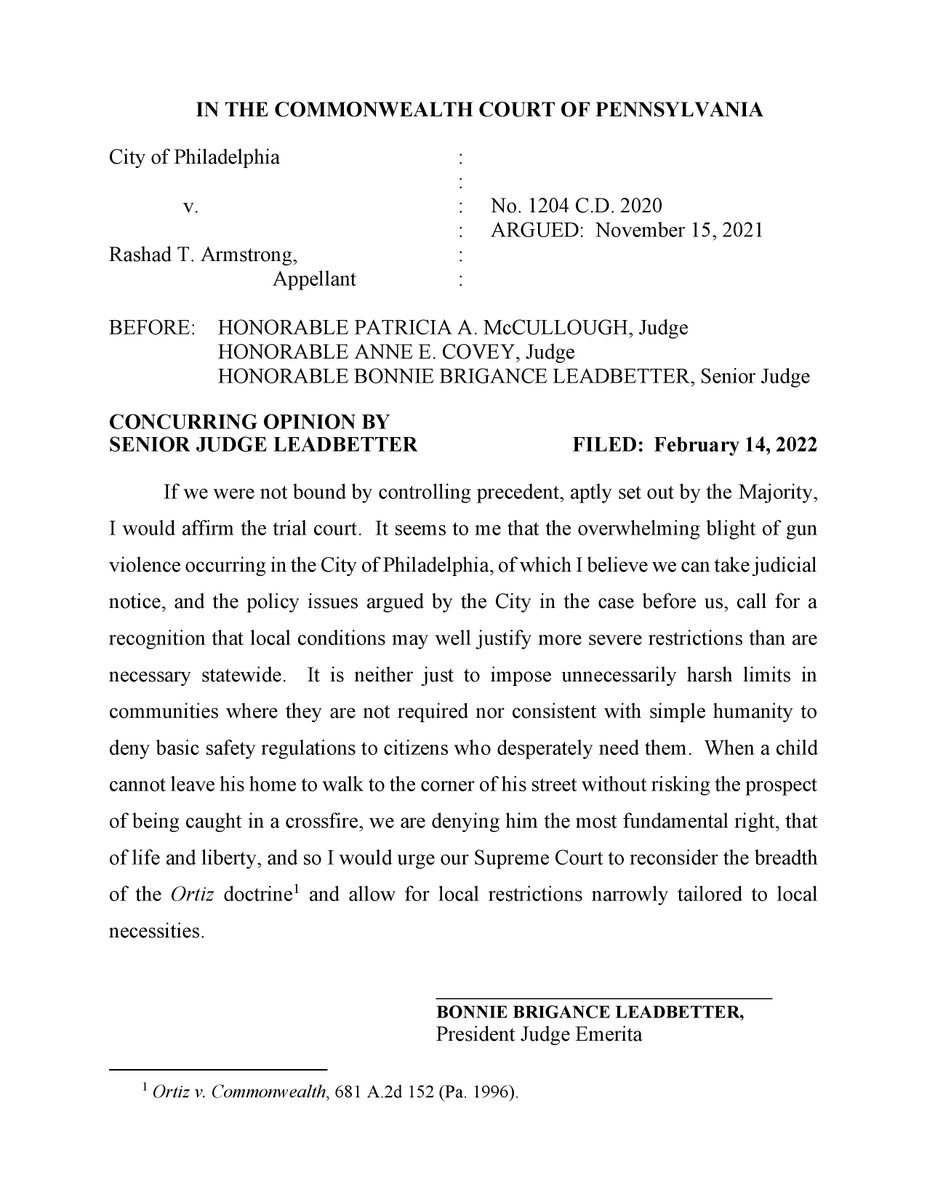 BREAKING: Philadelphia v. Armstrong (PA state court): Commonwealth Court rules that Philadelphia's "lost and stolen" gun ordinance violates state preemption, says prosecuting the case "evidences a form of bad faith and harassment on the part of the City." pacourts.us/assets/opinion…