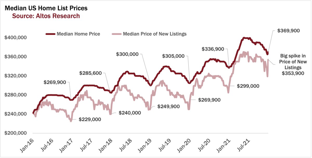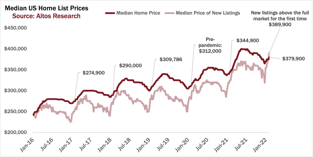 This week, for the first time ever(!), the price of newly listed homes (light red line) jumped above the price of the whole market (dark red).