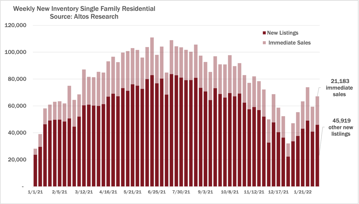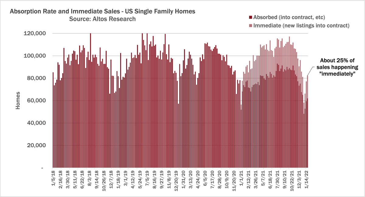 Since those immediate sales are both new inventory AND new sales in the same week, here's the other view. Immediate sales are 25% of all those going into contract this week. (We started tracking immediate sales last year.)
