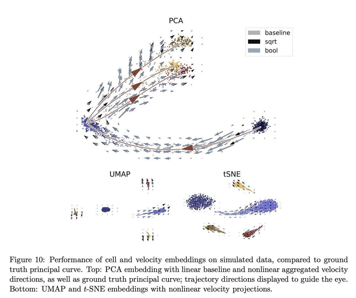 Without a rigorous model foundation, RNA velocity is not very meaningful, but that hasn't stopped people from using it to make pretty figures with arrows suggesting cell trajectories. We looked at the embeddings in detail, and that forms another large chunk of the paper. 16/
