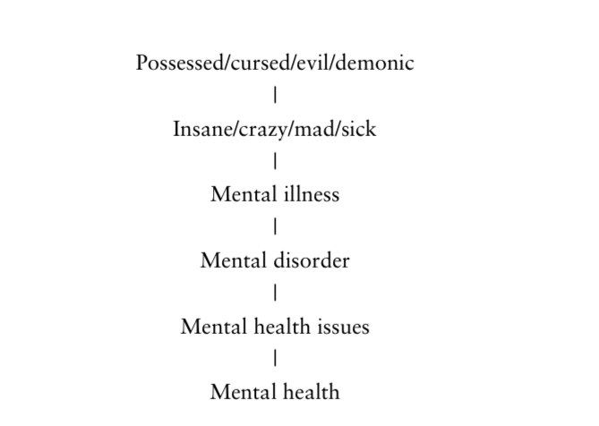 We have been deliberately encouraged to stop using words like ‘disorder’ and ‘illness’ despite mental health issues still being classified as ‘abnormalities’ and ‘syndromes’ and ‘disorders of the mind’. The language changed, but the concept didn’t.