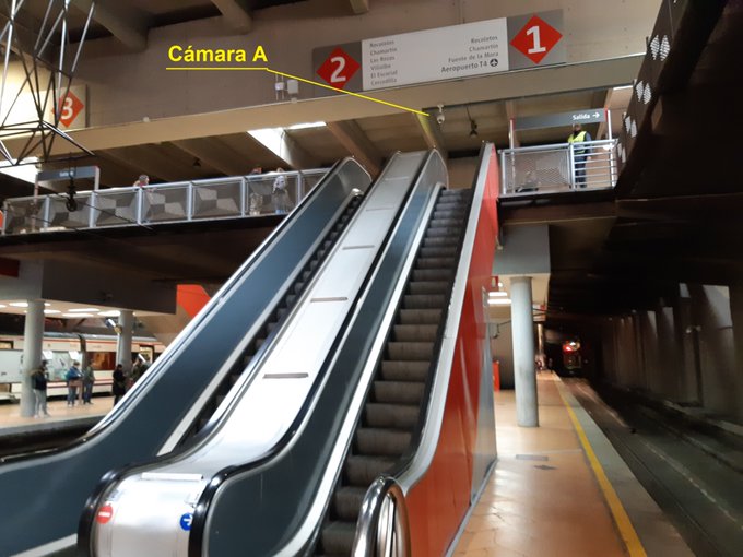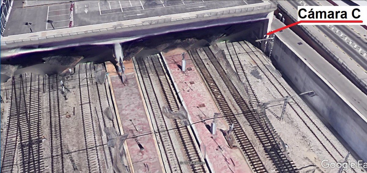 4- CÁMARA A.-En la pasarela central que vuela sobre las vías de la estación, en su cruce con el andén de las vías 1 y 2, a la altura de la unión de los coches 3 y 4. En la grabación, da un giro de 360º, deteniéndose a los 180º al mirar al túnel. Es semiesférica y adosada al techo