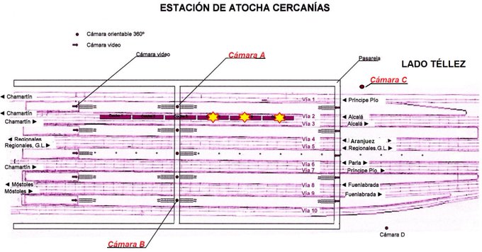 3-La grabación está compuesta por pequeñas tomas no continuas y efectuadas con 3 cámaras distintas, las denominadas A, B y C en este esquema, en el que también se ve la posición del tren atacado en Atocha