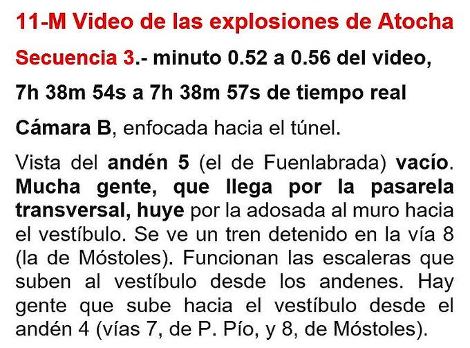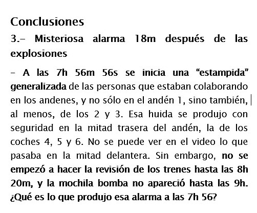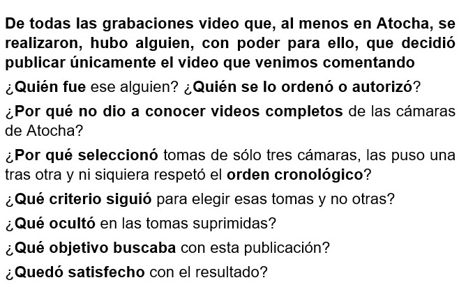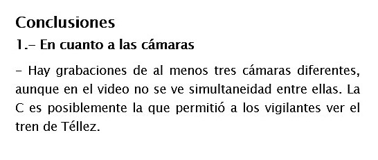 30- De todo lo anterior, podemos extraer las siguientes CONCLUSIONES: 1- En cuanto a las cámaras: siendo 3, casi todo el vídeo procede de una de ellas. En la estación había muchas más cámaras, pero no hay datos de lo que se pudo grabar con ellas, sólo se publicó lo de esas 3