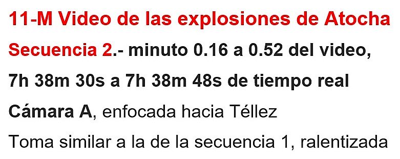 Es de las más largas, 16 s. Han pasado más de 3 minutos desde la anterior y casi 20 desde las explosiones. La cámara ha vuelto a girar 180º y mira hacia Téllez. Se avisa de algún peligro y todos corren. Escaleras paradas, Con esta secuencia termina el vídeo A