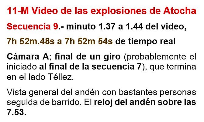 23-Ésta es una imagen del final de la secuencia 7. La cámara ha girado 180º. Es la zona de los coches 1, 2 y 3 del tren, situado ahora en el lado izquierdo. En esa zona el andén está casi vacío. Más tarde, a las 9:59, se producirá la explosión controlada por los Tedax del coche 1