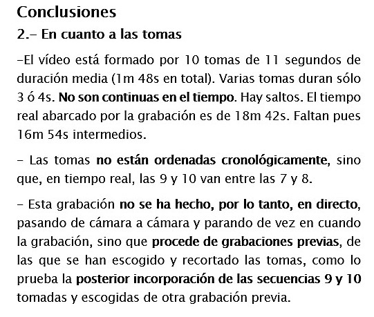 31- 2- En cuanto a las tomas: es evidente que hubo una manipulación de las distintas grabaciones, con grandes huecos y con alteraciones cronológicas. No puede ser una selección de cámaras que iba haciendo un operador, pues hay saltos atrás