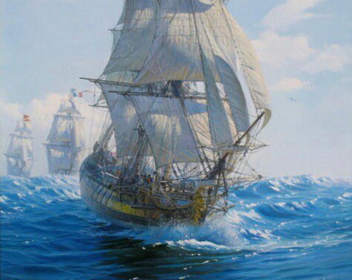 Es difícil saber a cuánto, pero posiblemente de largo entre las 10 y las 14 cuartas. Siendo así, los foques estarían más o menos bien dispuestos para la mayor y la de trinquete estaría mal braceadas. El oleaje va contraviento, lo que es posible pero no tan cerca del barco.