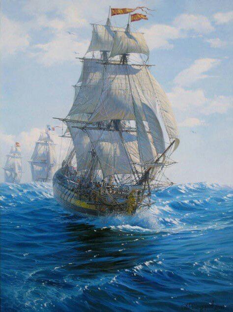 Es posible que en una fragata vaya embarcado un teniente general con mando de flota, pero no es lo habitual. Lo propio sería un navío de línea de 1ª clase y tres puentes. Los siguientes errores ya son náuticos. Según las grímpolas el viento le viene por la amura de estribor.