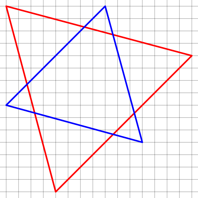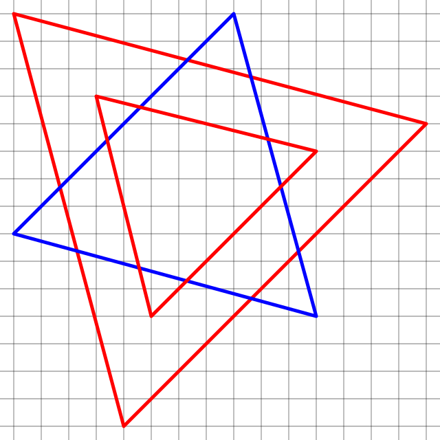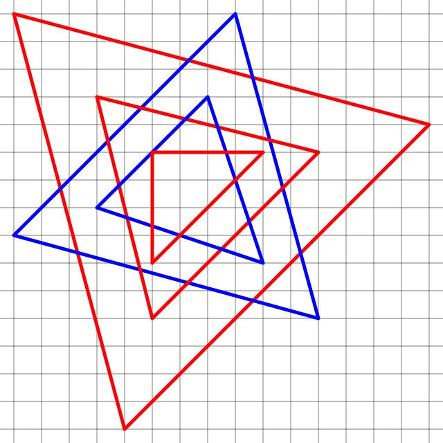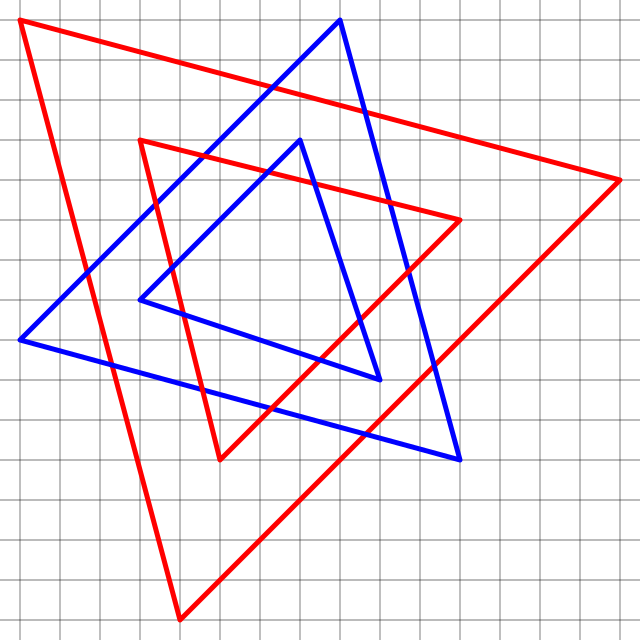 … if u,v,w are in the square lattice ℤ[i], then so are u′,v′,w′, and if they were an equilateral triangle, the new one too, with smaller area, leading to infinite regress. If we iterate this for the triangle above, we get less and less equilateral, revealing the fraud! •10/26