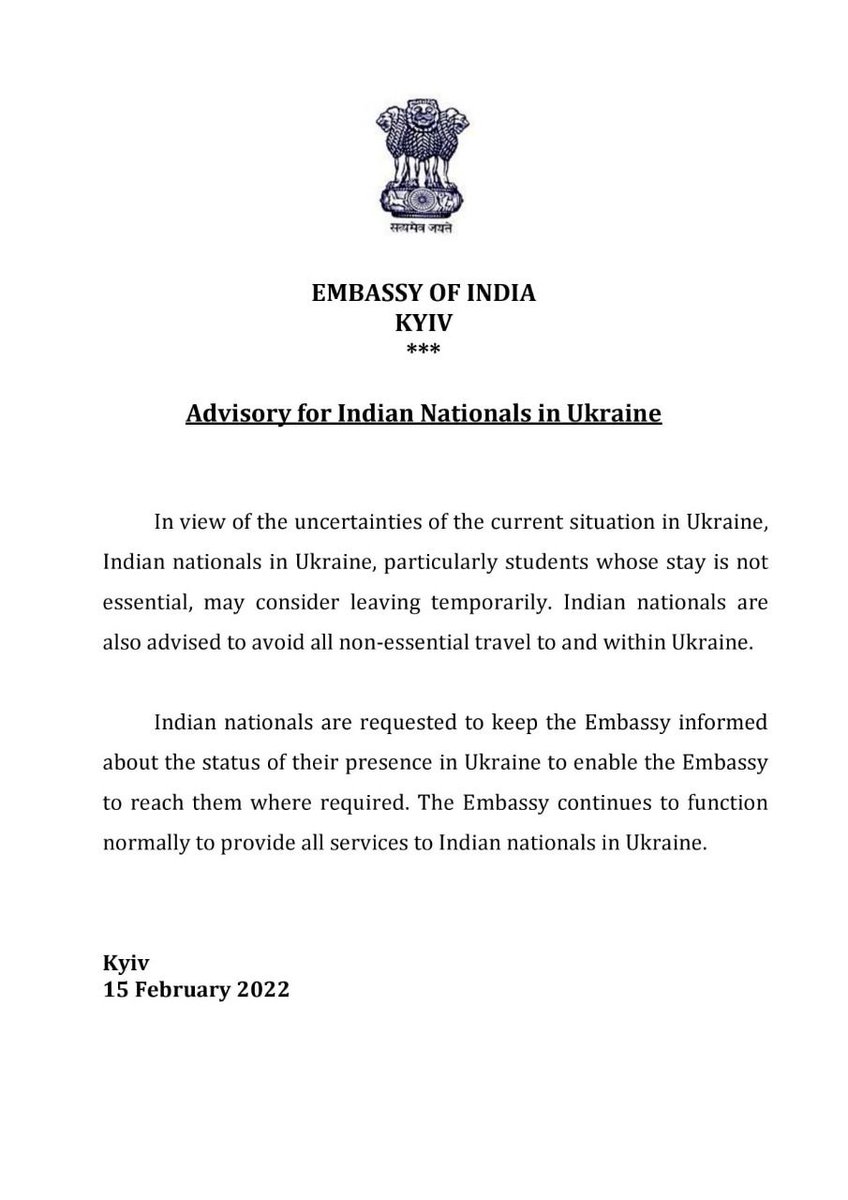 #Indian Embassy Issues Advisory On Ukraine-Russia Conflict, Asks Nationals To Evacuate