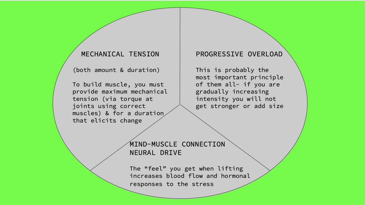 there are 3 main things that contribute to muscle gain from a training/exercise POV