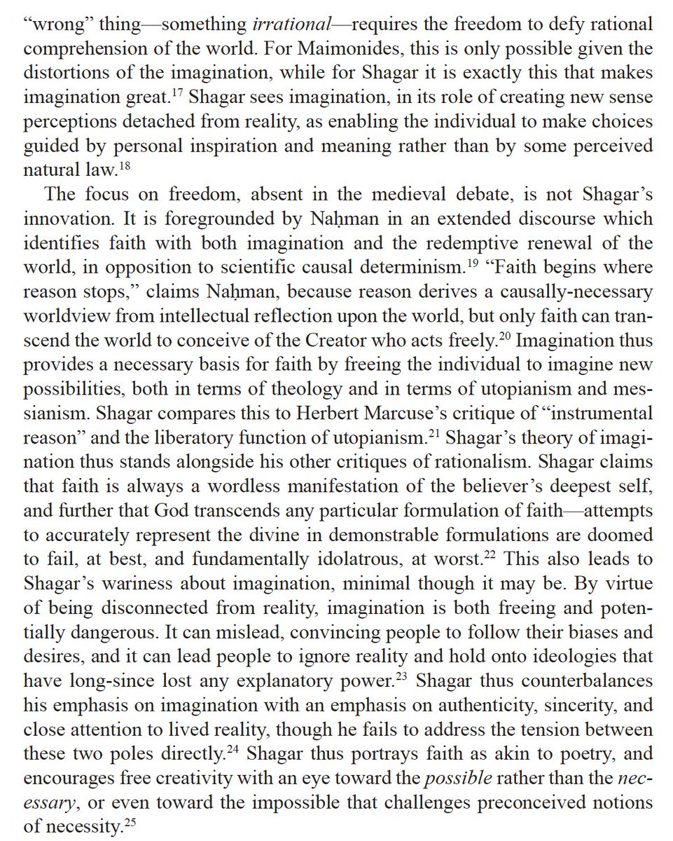 From the medieval discussion, Rav Shagar draws the idea of imagination as creative (Rambam) and inspirational (R. Yehuda Halevi)—critical elements, for Rav Shagar, of freedom and faith.