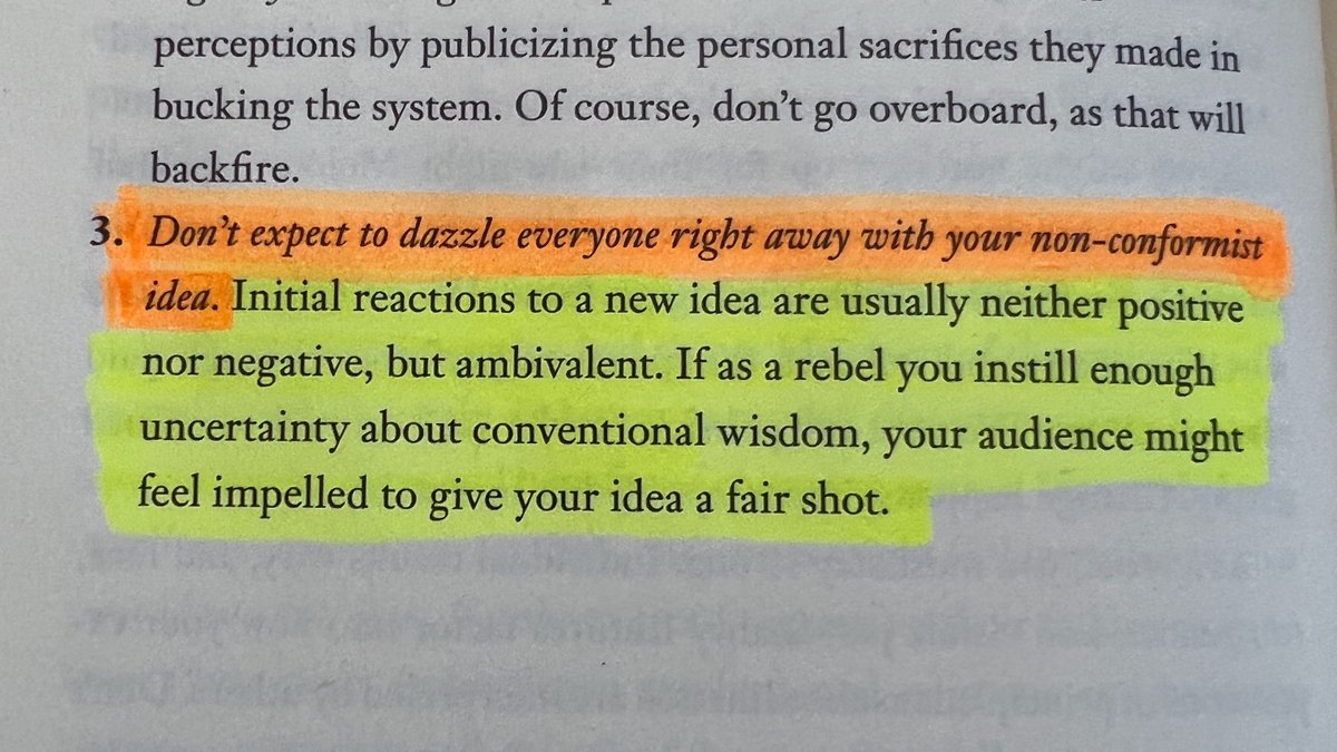 "Initial reactions to a new idea are usually neither positive nor negative, but ambivalent. If as a rebel you instill enough uncertainty about conventional wisdom, your audience might feel impelled to give your idea a fair shot."