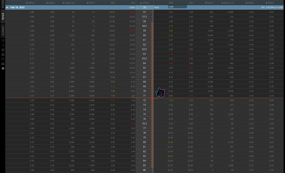 Example 2/ In TastyTrade the strike bar in the middle is highlighted in a pale orange to show you the potential move.