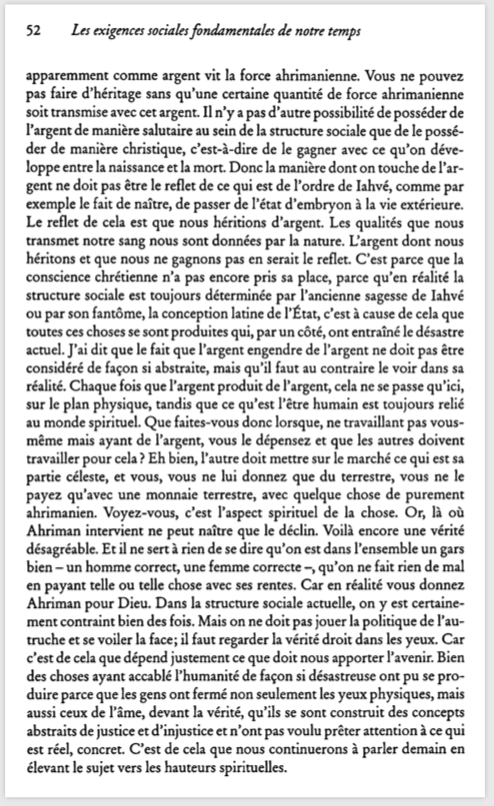 Alors j’ai une question aux banques éthiques d’inspiration anthroposophe. Vous expliquez à vos clients que l’épargne c’est ahrimanien ? Vous leur expliquez que « les grandes catastrophes de notre temps », selon Steiner, sont la faute du « penser Iahvé » ?