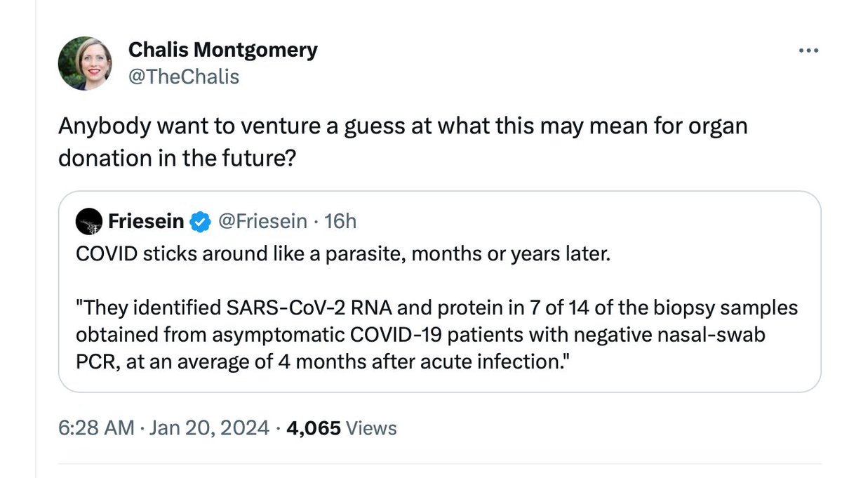 Long Covid/Long Vaxx/Long Spike means all human fluids, (blood, semen, breast milk) tissue and organ donations must be screened for persistent virus, viral reservoirs or spike proteins. >