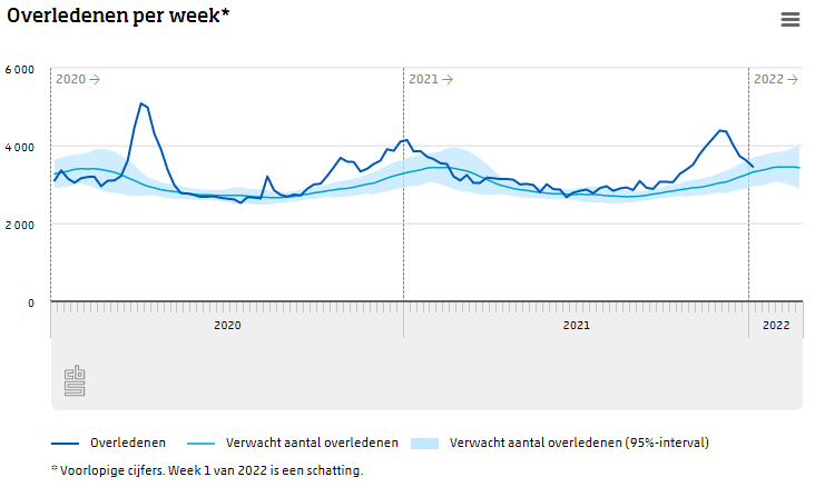 Sinds begin augustus (wk 31) van 2021 ligt de sterfte boven de verwachte sterfte en bijna elke week buiten het interval van gewoonlijke fluctuaties, zodat er sprake was van oversterfte. Sinds de laatste week van 2021 ligt de sterfte binnen het interval en is er geen oversterfte.