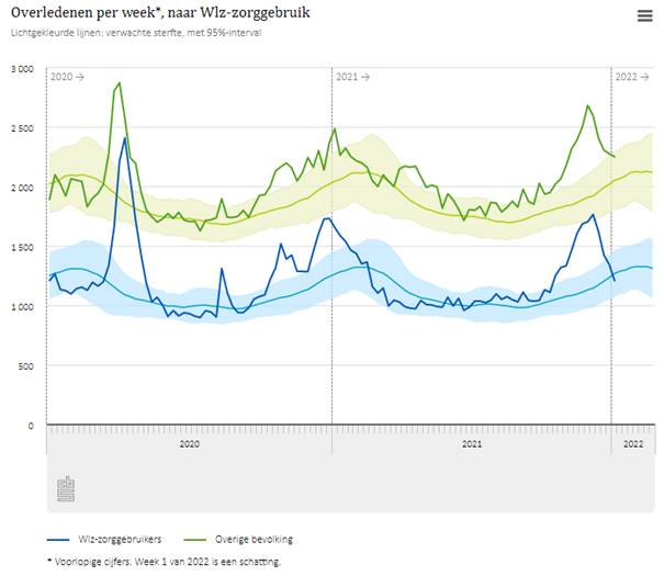 Sinds week 50 van 2021 (medio december) daalt de sterfte onder Wlz-zorggebruikers. In de laatste week van 2021 en de eerste week van 2022 is er geen oversterfte meer. Onder de overige bevolking in week 1 ook niet meer.