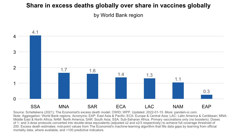 Als je per regio het aandeel vd totale oversterfte wereldwijd deelt door het aandeel vd totale vaccinaties wereldwijd wordt duidelijk dat SSA sterk onderbedeeld, onbeschermd werd en EAP een zeer lage oversterfte combineert met relatief veel vaccinaties.