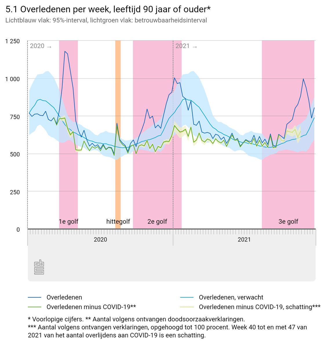 Hoewel extra onderzoeken nodig zijn, lijkt C19-sterfte een groot deel vd oversterfte in dit deel vd 3e golf te zijn, maar mogelijk niet alle oversterfte. Totale sterfte excl. C19-sterfte ligt tijdens 1e gedeelte vd 3e golf nog iets boven verwachte sterfte. Hier de oudsten: 6/n