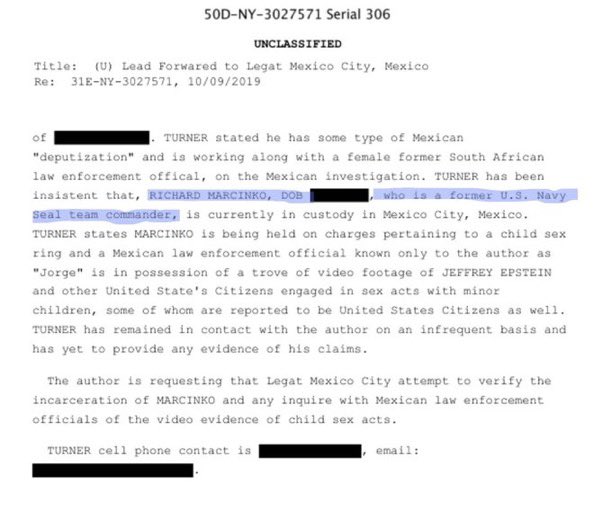 De acuerdo a la comunicación confidencial del FBI 50D-NY-3027571 Serial 306, Richard Marcinko fue detenido en Ciudad de México en posesión de videos sexuales de Jeffrey Epstein con menores de edad e investigado como parte de una red de pederastia.