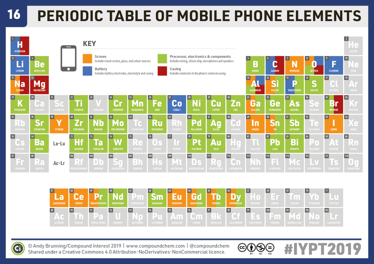 Mais de 50 elementos da tabela periódica - como ferro, cobre, alumínio, níquel, estanho, cobalto e lítio - são encontrados num único aparelho celular.