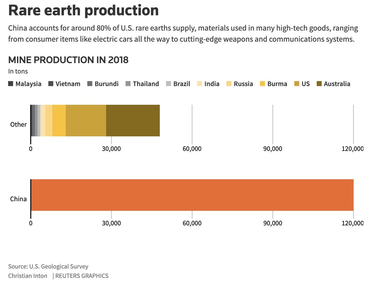 Adivinha onde ocorre a maior parte da mineração de metais de terras raras? Na China. E com folga: mais de 70% da oferta global.