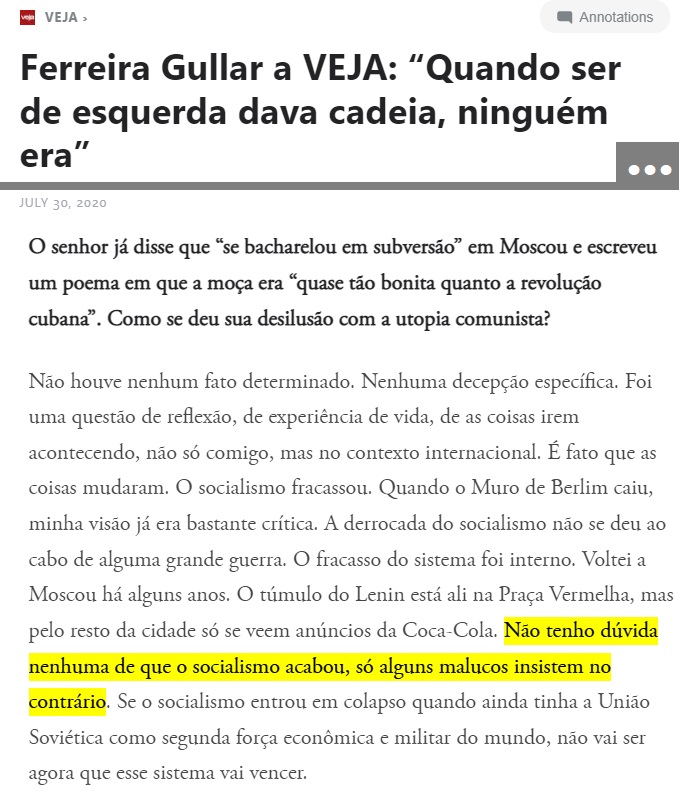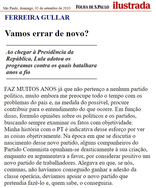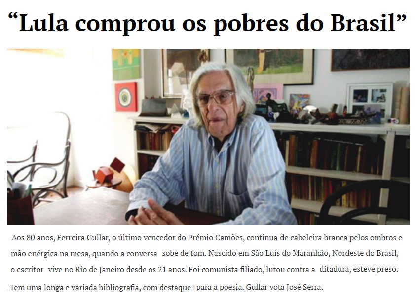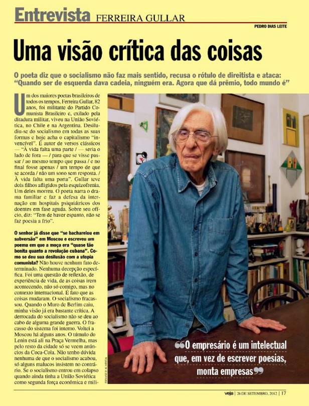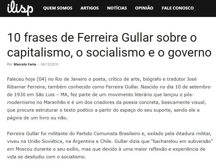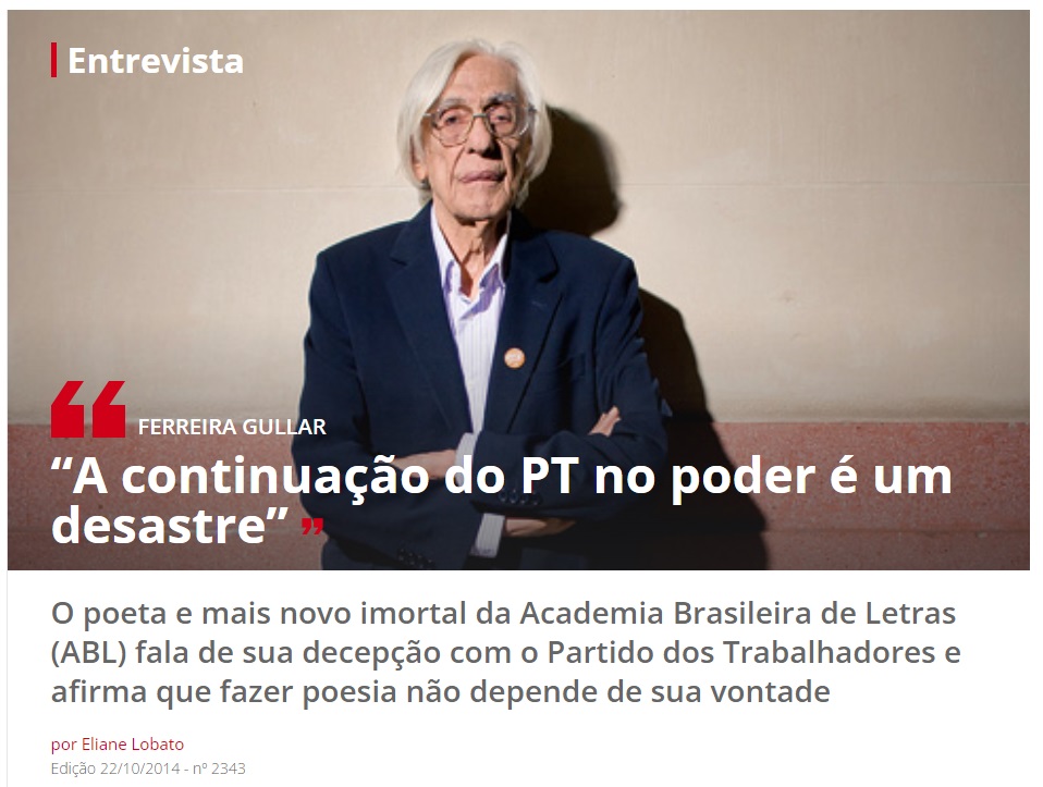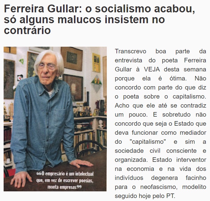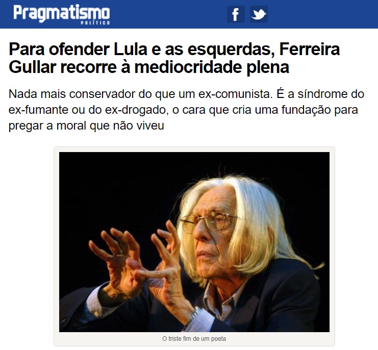 A exaltação de Gullar demonstra desconhecimento histórico ou absoluta falta de comprometimento com o ideário socialista. Afinal, Gullar se filiou ao PCB nos anos 60, mas seguiu o mesmo caminho de ex-pecebistas infames como Olavo de Carvalho, Carlos Lacerda e Roberto Freire.