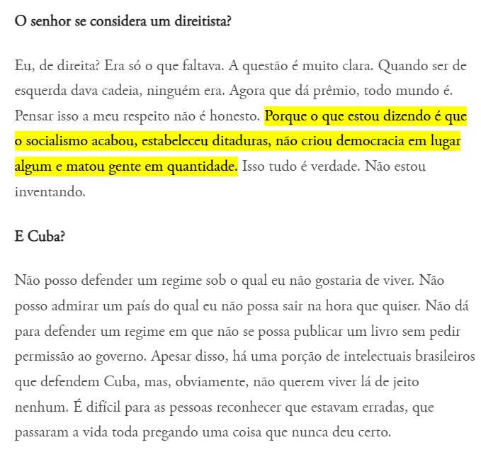 Em uma entrevista à Veja, disse que somente malucos ainda acreditavam no socialismo e asseverou que os governos socialistas só tinham servido para criar ditaduras e matar pessoas.